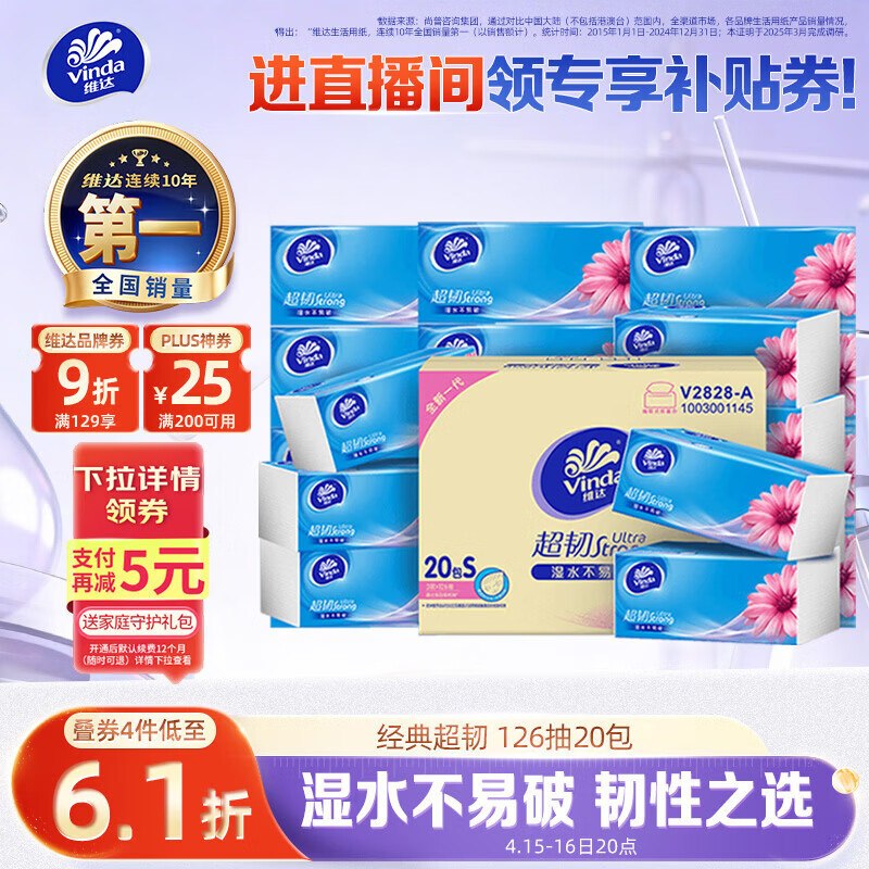 🚦 plus先领200-25卷 【自营】超韧抽纸126抽×20包 Plus