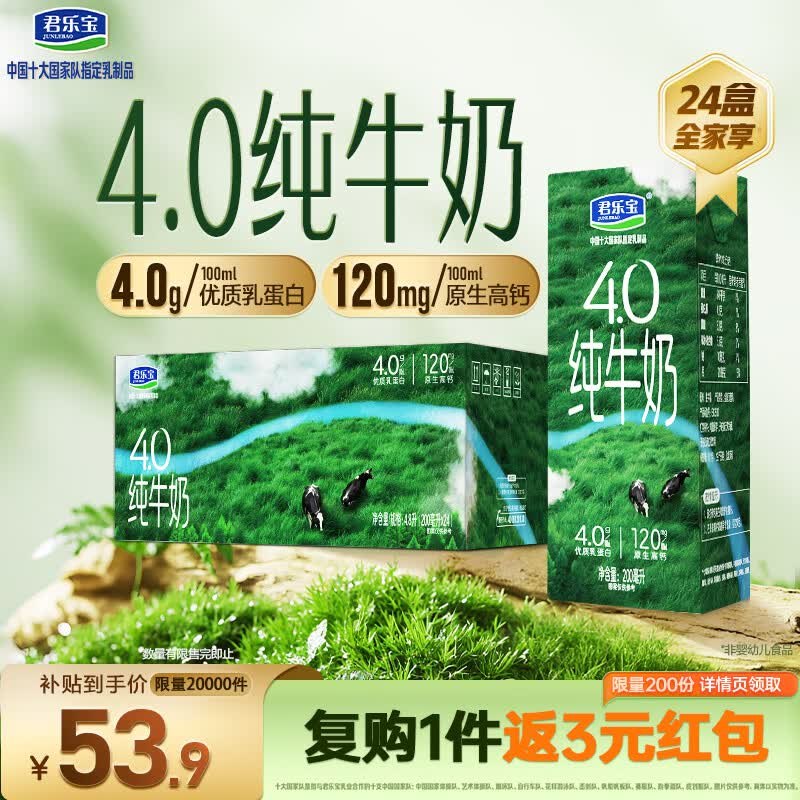 🚦 【自营】4.0g蛋白纯牛奶24盒 买2件102.6元,plus97.2元
