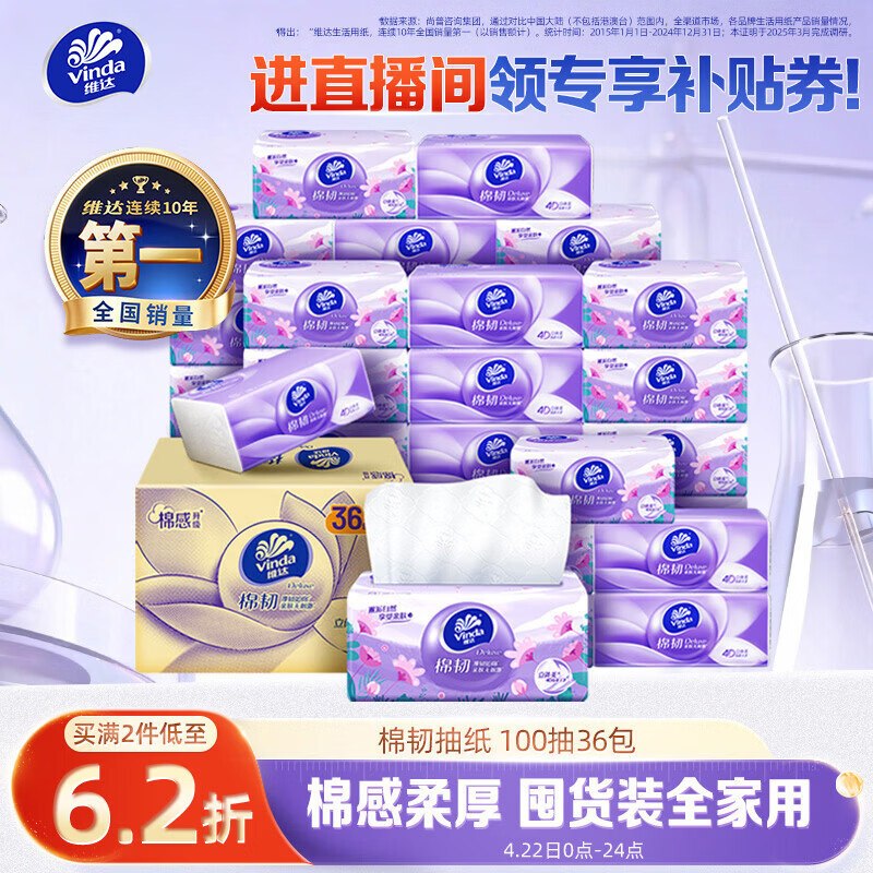 🚦 【自营】维达 棉韧立体美 S码抽纸3层100抽×36包 plus买2件7