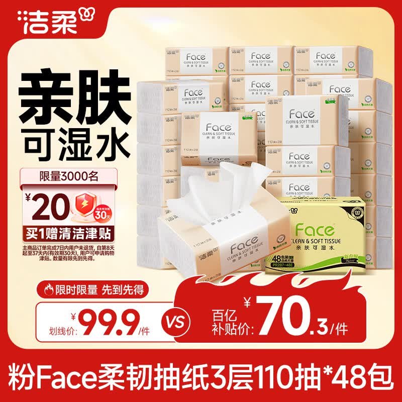 🚦 洁柔 粉Face抽纸110抽×48包 70.3元自营包邮,赠20元津贴