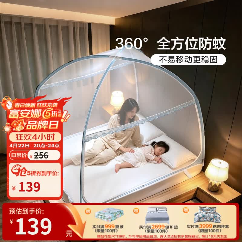 🚦 先领5折补帖卷 富安娜 双开门蒙古包蚊帐1.8米 99元,高品质 赠云