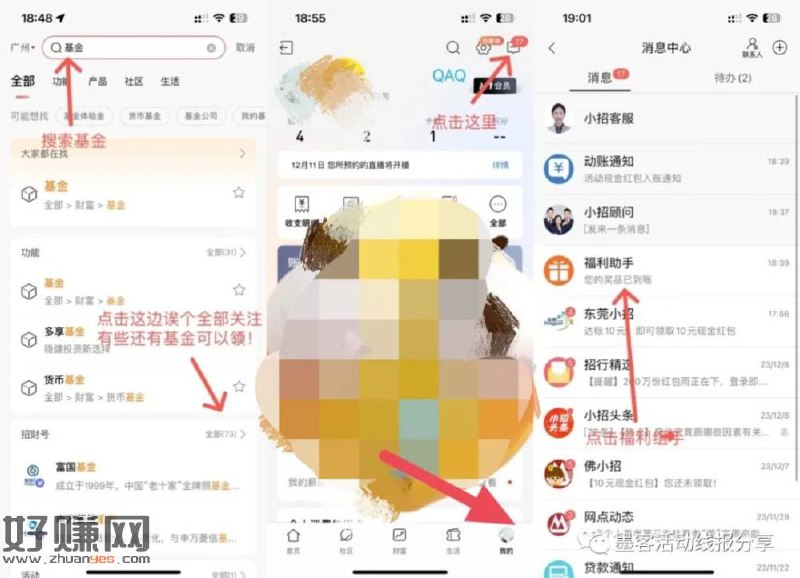 招行体验金领随机红包亲测10元应用商店下载“招商银行APP”->搜索“基金”->底部->“73家招财号”->每家关注一下->返回我的“右上角消息”->进入->福利助手->点击->领取体验金->大概10万体验金->坐等收益即可->然后提现->不懂看一下操作图!