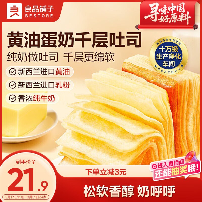 🚦 先领2张卷 良品铺子 黄油蛋奶吐司500g 15.9元自营包邮,营养