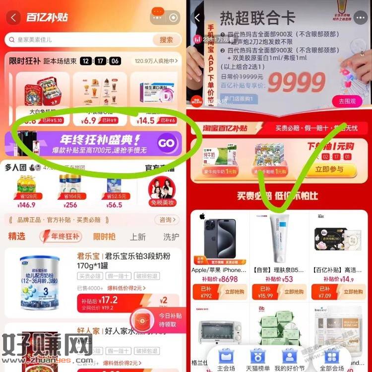 淘宝搜百亿补贴,下一单10以上的抽完事退掉,认1元购必中牛奶或者纸