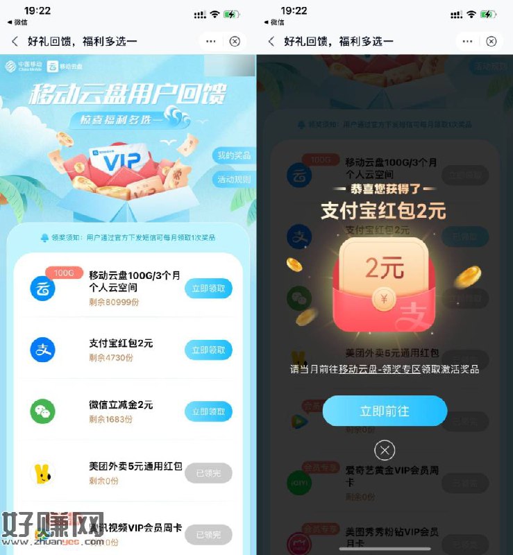 【移动云盘领视频会员或立减金】新一期,限部分人参与!打开地址->登陆账号->5个奖品自选1个->直接领取直充秒到(如果提示转发无效就代表没资格)