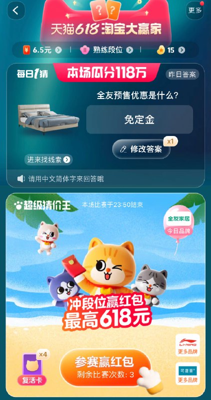 今天选Btb搜“淘宝大 赢 家” 有每日一猜和超级猜价王,具体看图2 (今天答案是:免定金)