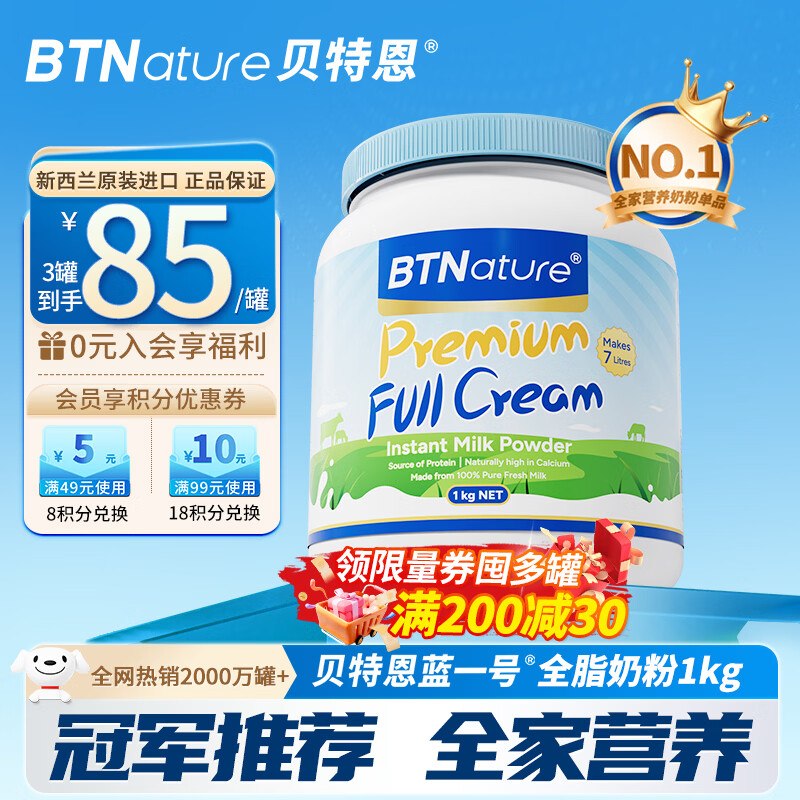 🚦 先领80-36补帖卷 BTNature 全脂奶粉1kg 实.付59元,