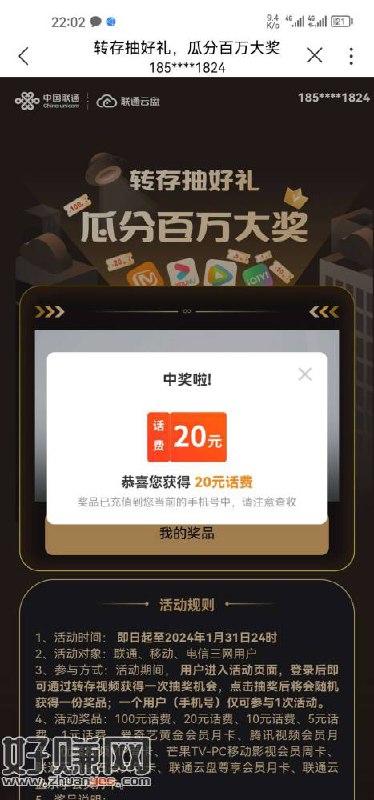 中国联通app搜云盘,点击联通云盘进去后点下面的转存抽好礼试一下
