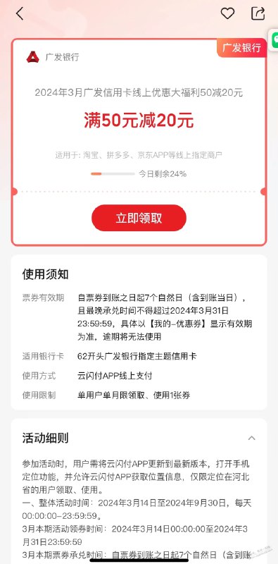 【河北地区】速度,马上没名额,广发XYK云闪付领取50-20